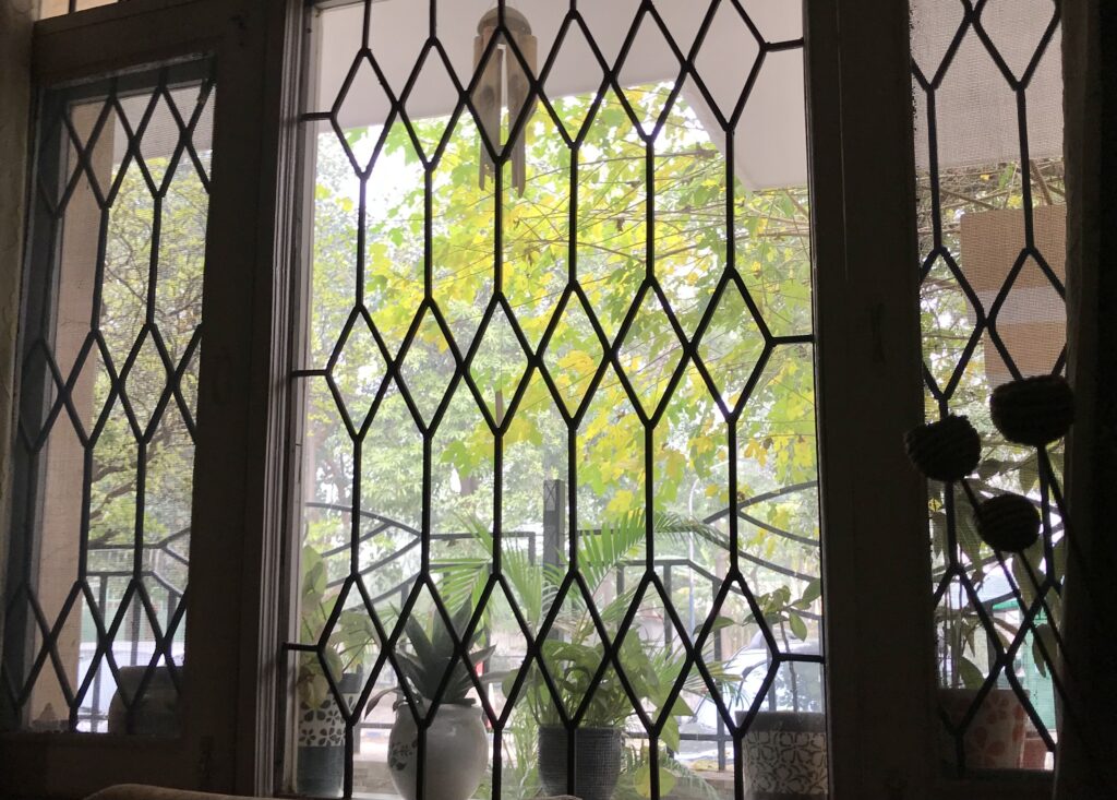 An odd bird chirping. Green outside my window. Blue behind the green.